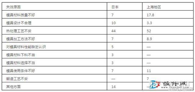 这个数据列表说明的是对以往事故的统计结果,在对未来事故的预测上是不适用的。就是说对明天的某个模具失效的原因判定,不能就此认为模具失效的原因热处理占44~52%。而是要针对性的做分析。这个统计数据误导了不少人,让人们形成了一个思维定势:认为模具失效就是热处理问题。希望大家注意这个问题。